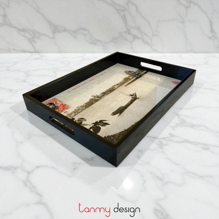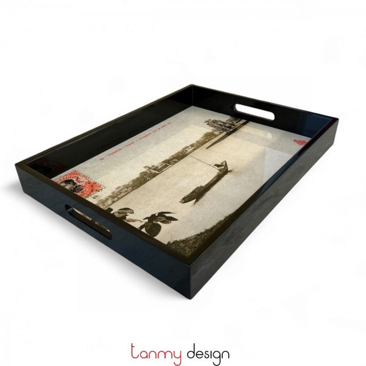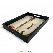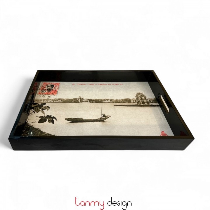 Khay sơn mài chữ nhật tranh Hồ Hoàn Kiếm đen 42*32*5cm