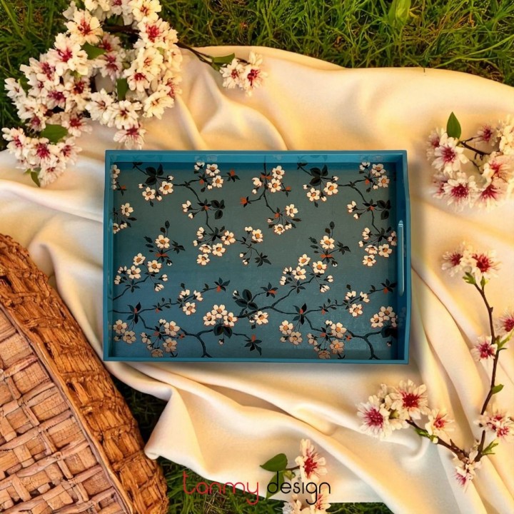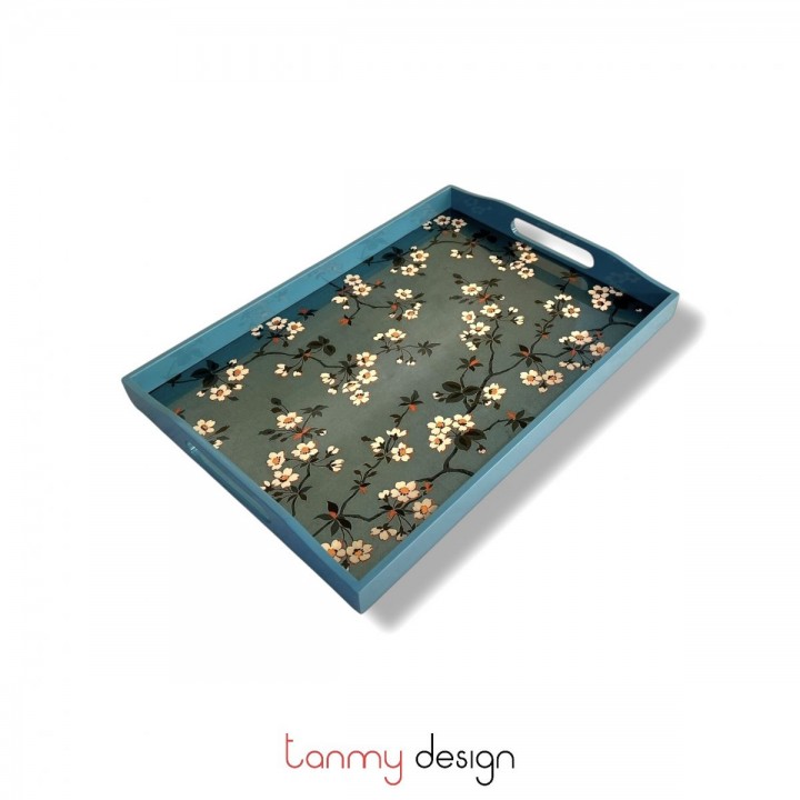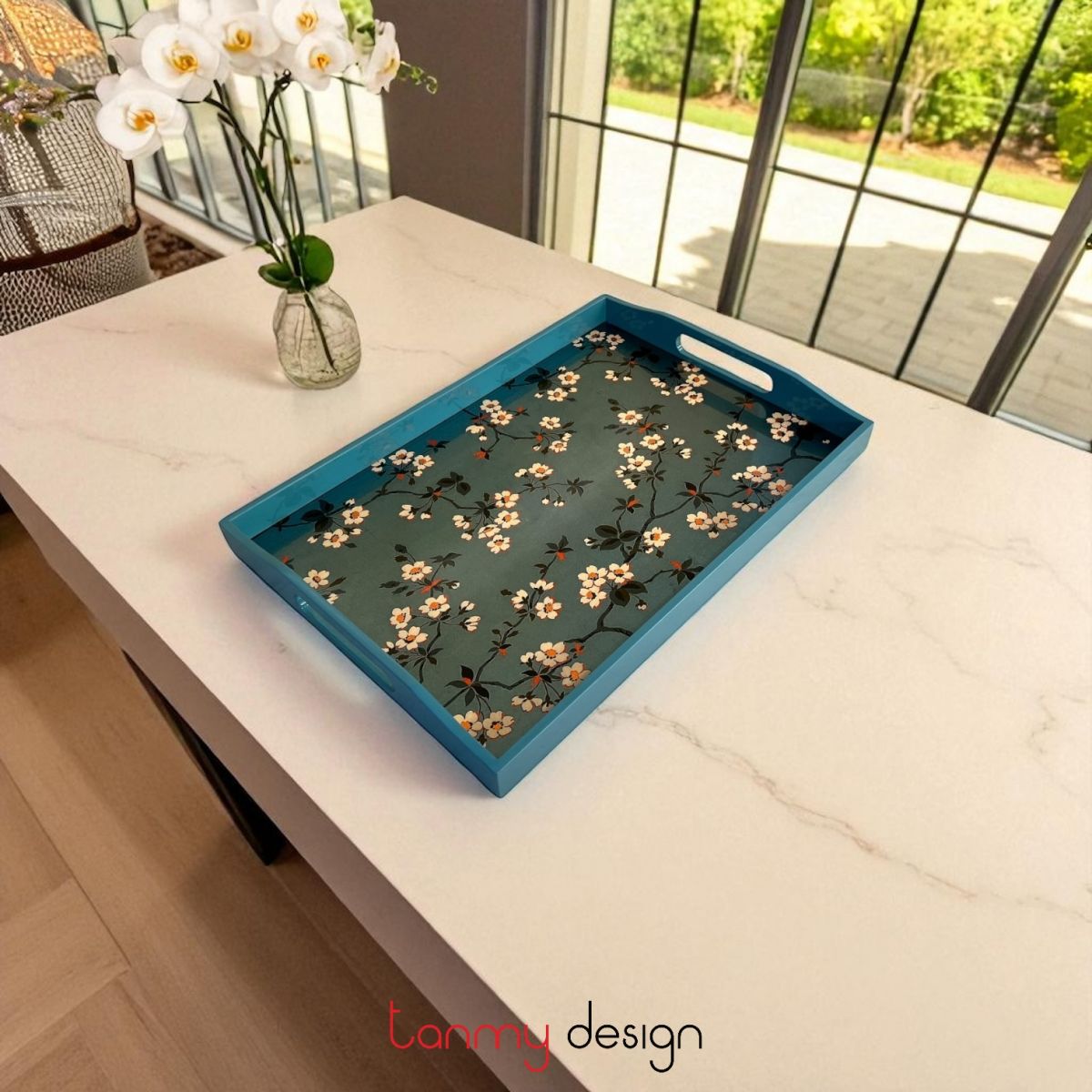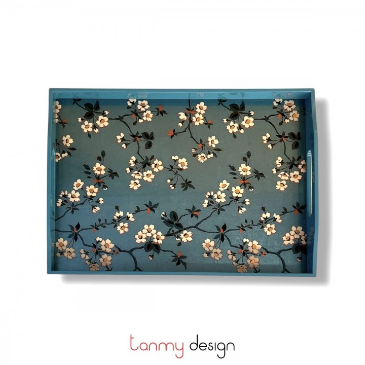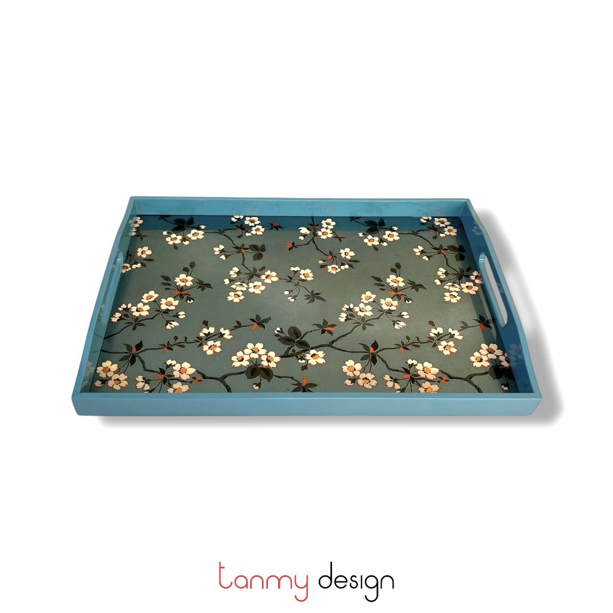 Khay sơn mài chữ nhật xanh lơ dán bạc hoa mận 28*40*H4cm