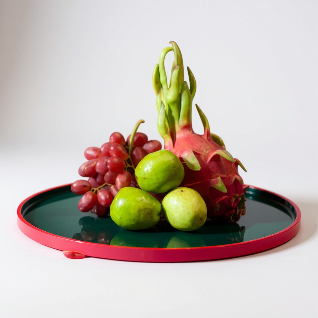 Khay sơn mài tròn viền đỏ thành hồng sen nền xanh lục bảo D40cm