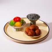 Khay sơn mài tròn viền xanh tím than nền trắng kem D34cm
