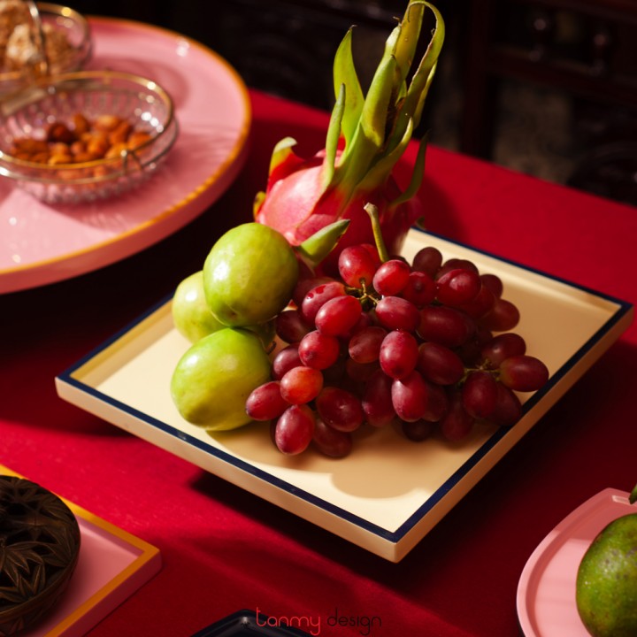 Khay sơn mài vuông viền xanh tím than nền trắng kem 25.5cm