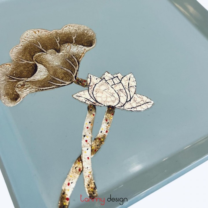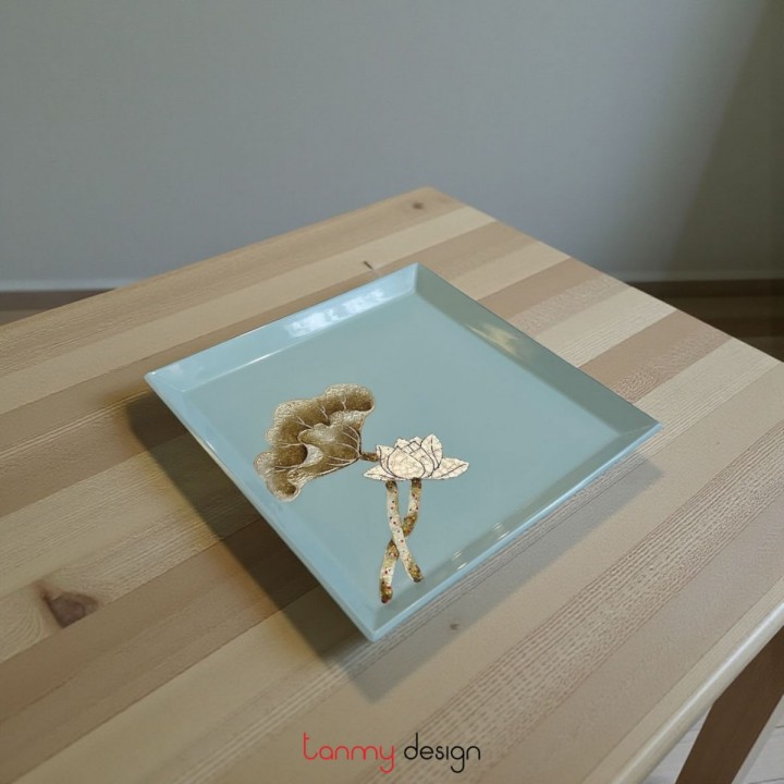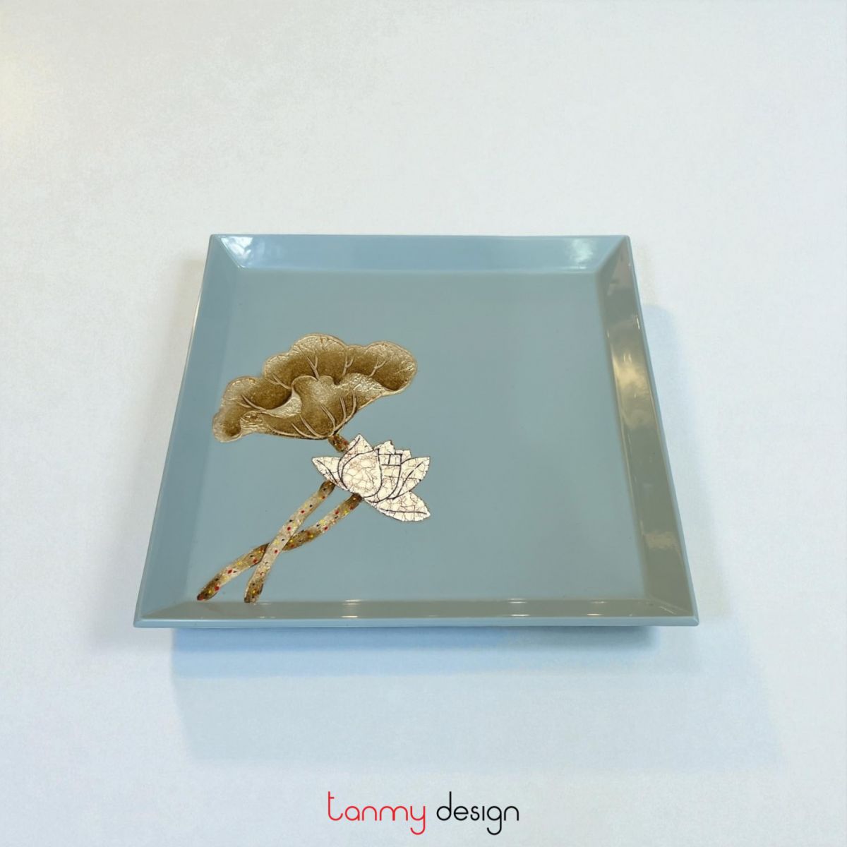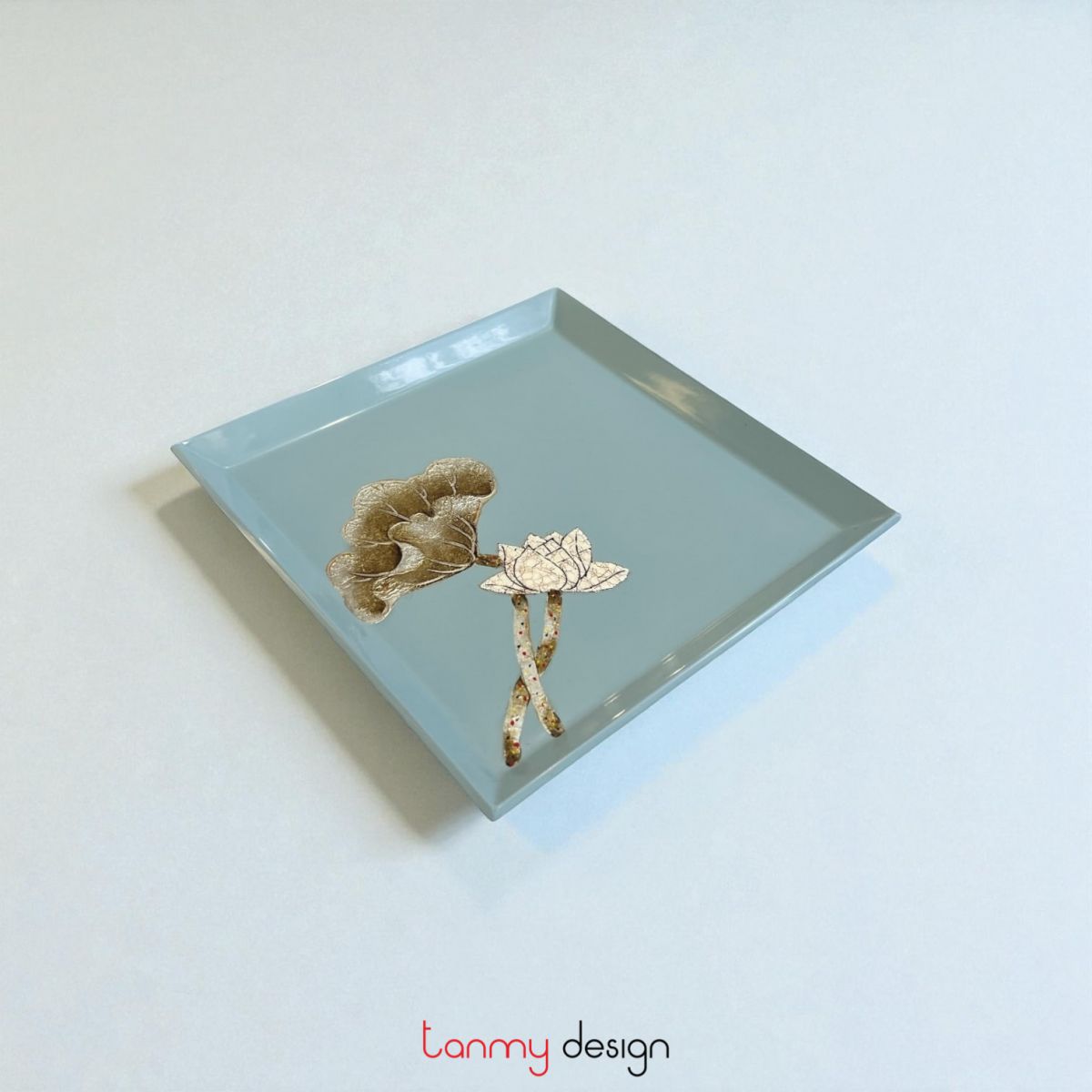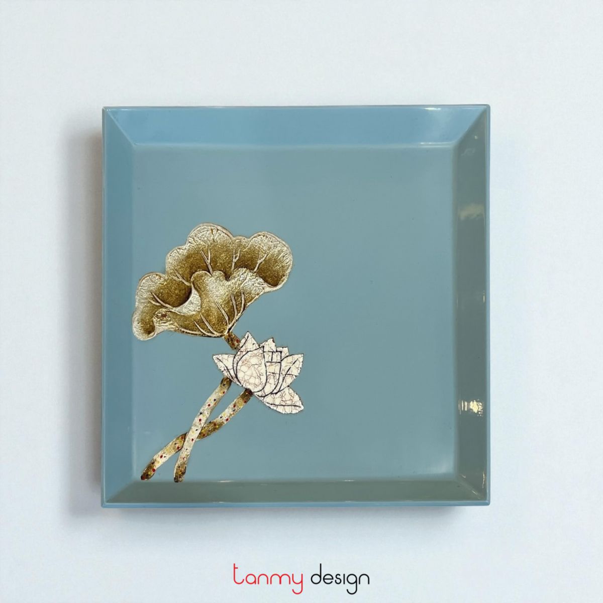 Khay sơn mài vuông xanh lá vát cạnh vẽ sen 22 cm