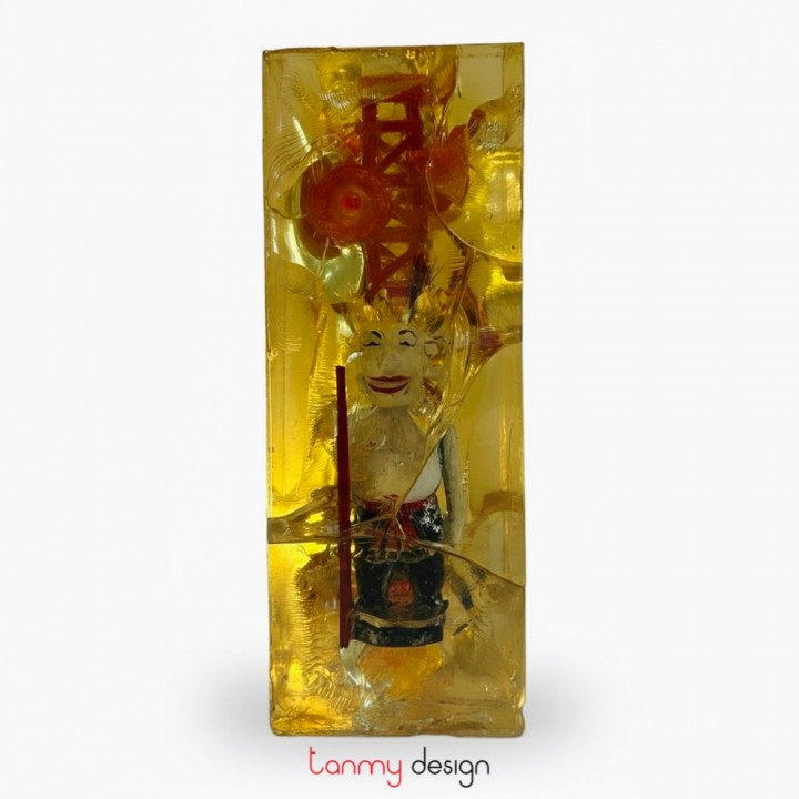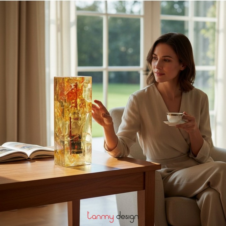 Cách làm “hóa thạch” của Vương Văn Thạo không giống ai. Sau khi đi khảo sát, chụp ảnh, anh đắp mô hình ngôi nhà, cổng làng... bằng đất, làm khuôn slicon rồi sau đó là đổ trùm composite “trong suốt” lên để bao bọc lấy, tạo cảm giác như một khối hóa thạch, hay nói cho đúng hơn là “nhốt” những ngôi nhà cổ, cổng làng cổ trong khối màu hổ phách với hai màu chủ đạo vàng, đỏ tuyệt đẹp.