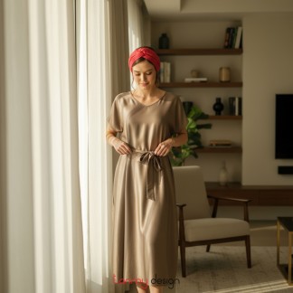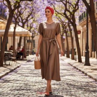 Chiếc váy thoải mái cho mọi dịp, cổ chữ V, dài đến đầu gối này cùng với chiếc dây đai được may vừa vặn buộc ở eo.