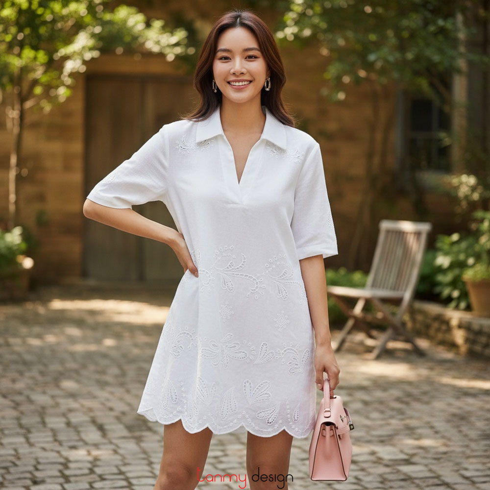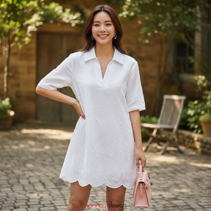 Váy chui cổ đức xẻ V thêu bô đê