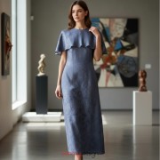 Váy lụa cổ lá sen to cách điệu họa tiết khắc đá T10 xanh chàm