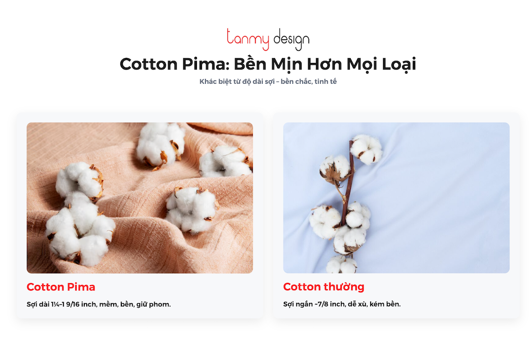 Cotton Pima vượt trội hơn cotton thường ở độ mềm mại, độ bền và khả năng giữ màu, nhờ cấu trúc sợi dài vượt trội và quy trình xử lý tinh xảo phù hợp với các sản phẩm cao cấp.