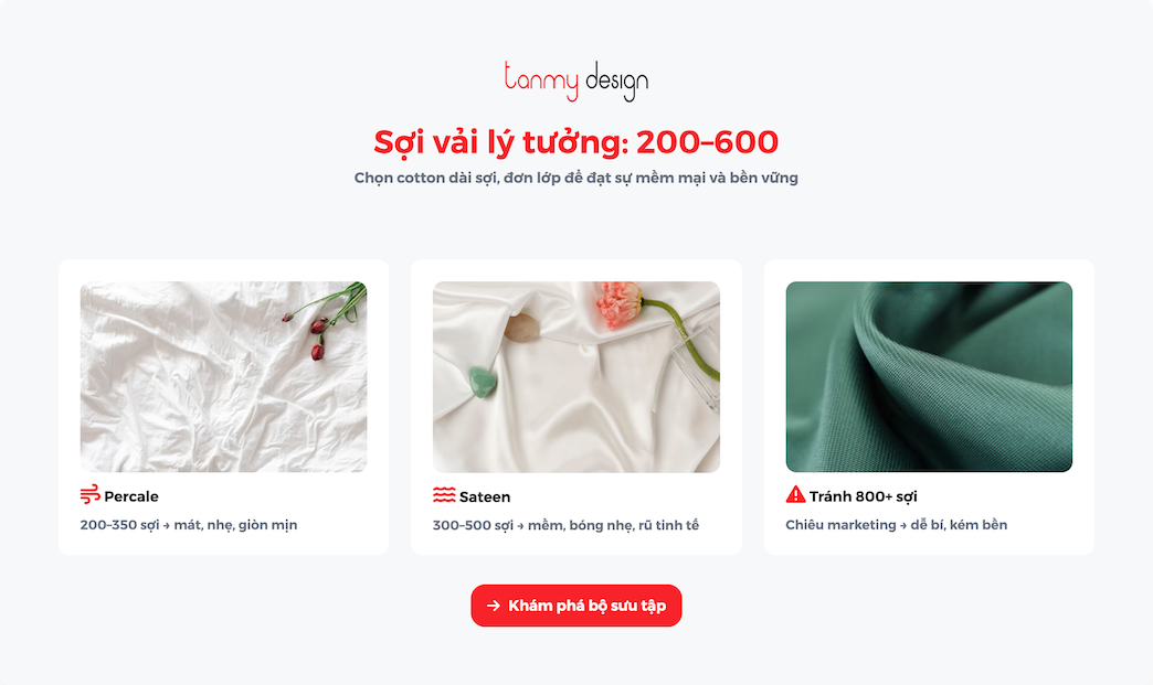 Với vải percale, con số lý tưởng nằm trong khoảng 200–400, tạo độ mát và cảm giác giòn, mịn đặc trưng. Vải sateen lại đạt đỉnh ở mức 300–600, mang đến độ bóng nhẹ và độ rũ tinh tế. Các thương hiệu cao cấp quốc tế thường chọn mức 200–600 sợi như chuẩn mực, và cảnh báo rằng các loại vải ghi đến 800+ sợi thường là chiêu trò marketing, dùng sợi nhiều lớp hoặc quá mỏng – gây bí, kém bền, và dễ xù lông.