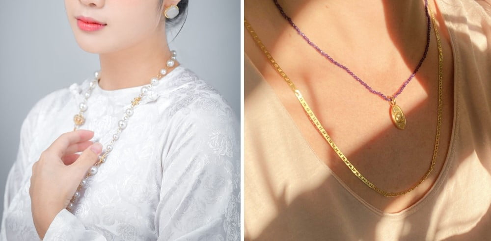 Với áo dài cổ cao, hãy chọn kiềng truyền thống hoặc chuỗi ngọc trai đơn giản – những món trang sức không chỉ tôn dáng cổ mà còn thể hiện nét đẹp cổ điển Việt. Nếu muốn phá cách nhẹ nhàng, vòng dài hoặc kiểu lariat giúp kéo dài dáng người, tạo vẻ hiện đại mà không mất đi sự thanh lịch.