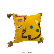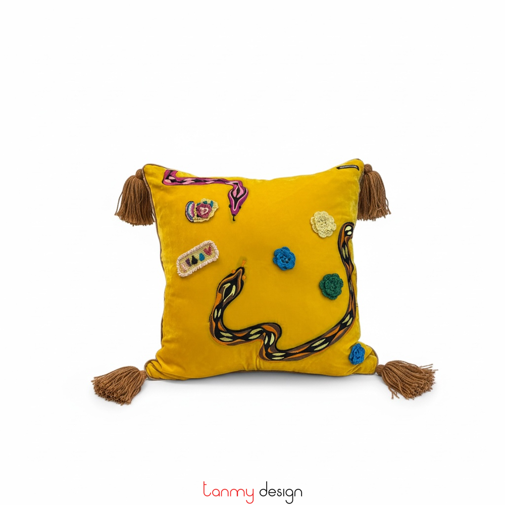 Vỏ gối vuông thêu rắn đính hoa móc nhung vàng 45x45 cm