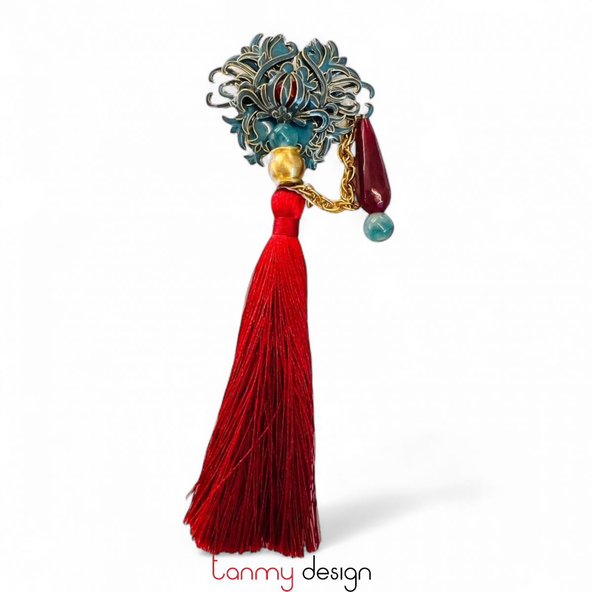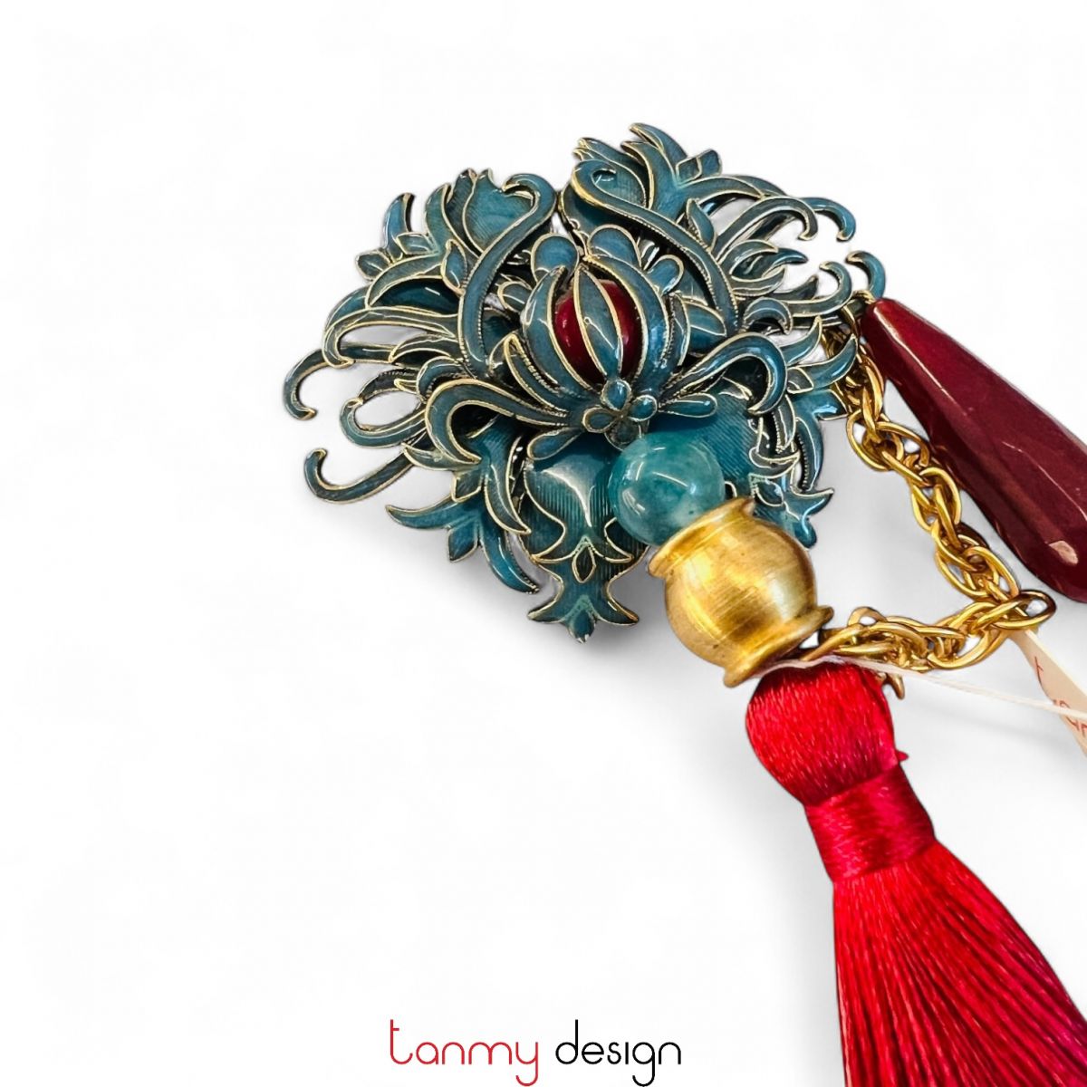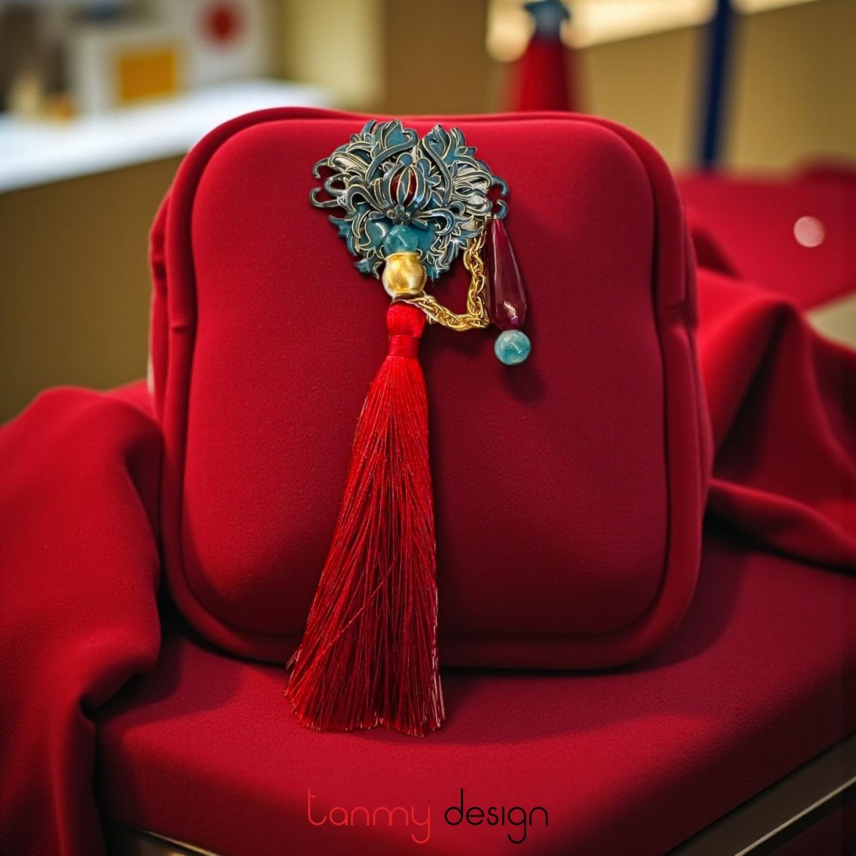 Cài áo kim loại , tua rua đỏ đô, đá mã não đỏ