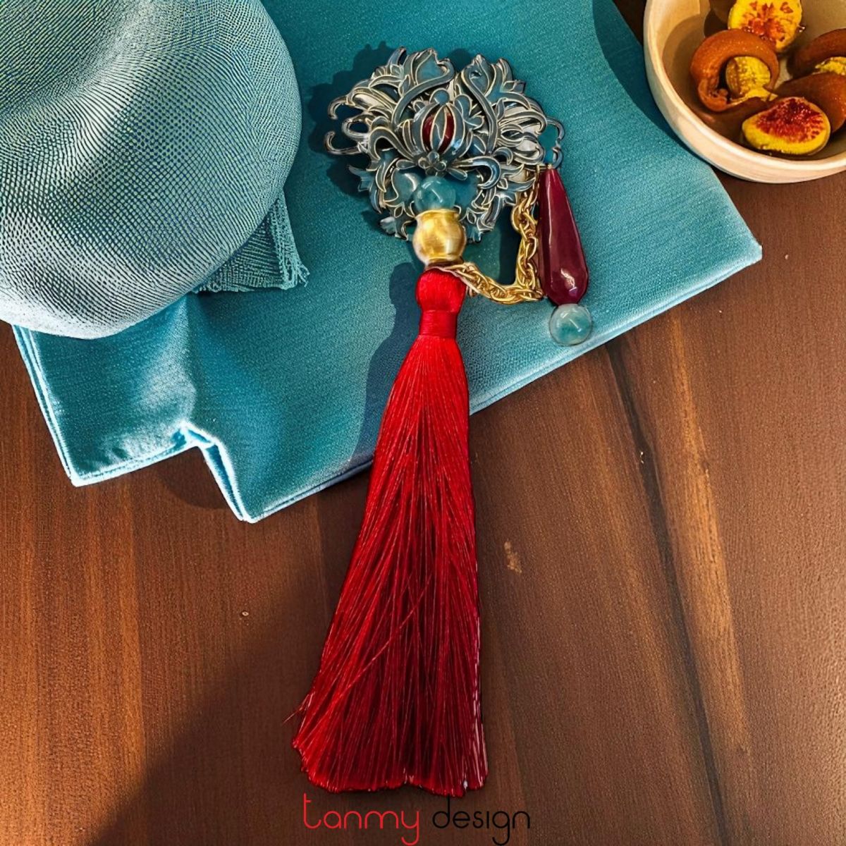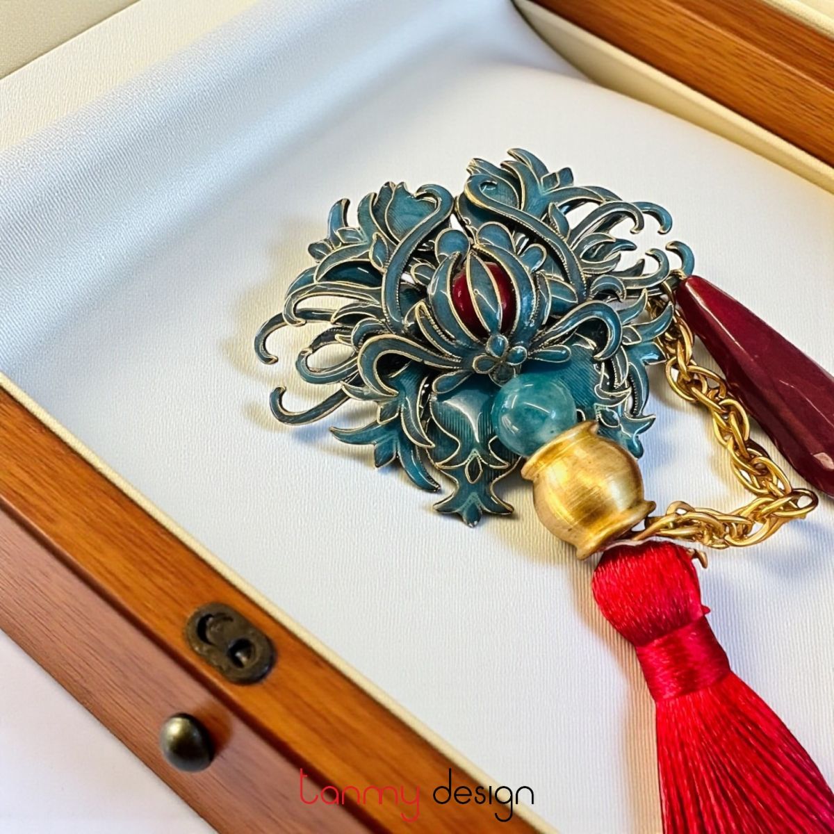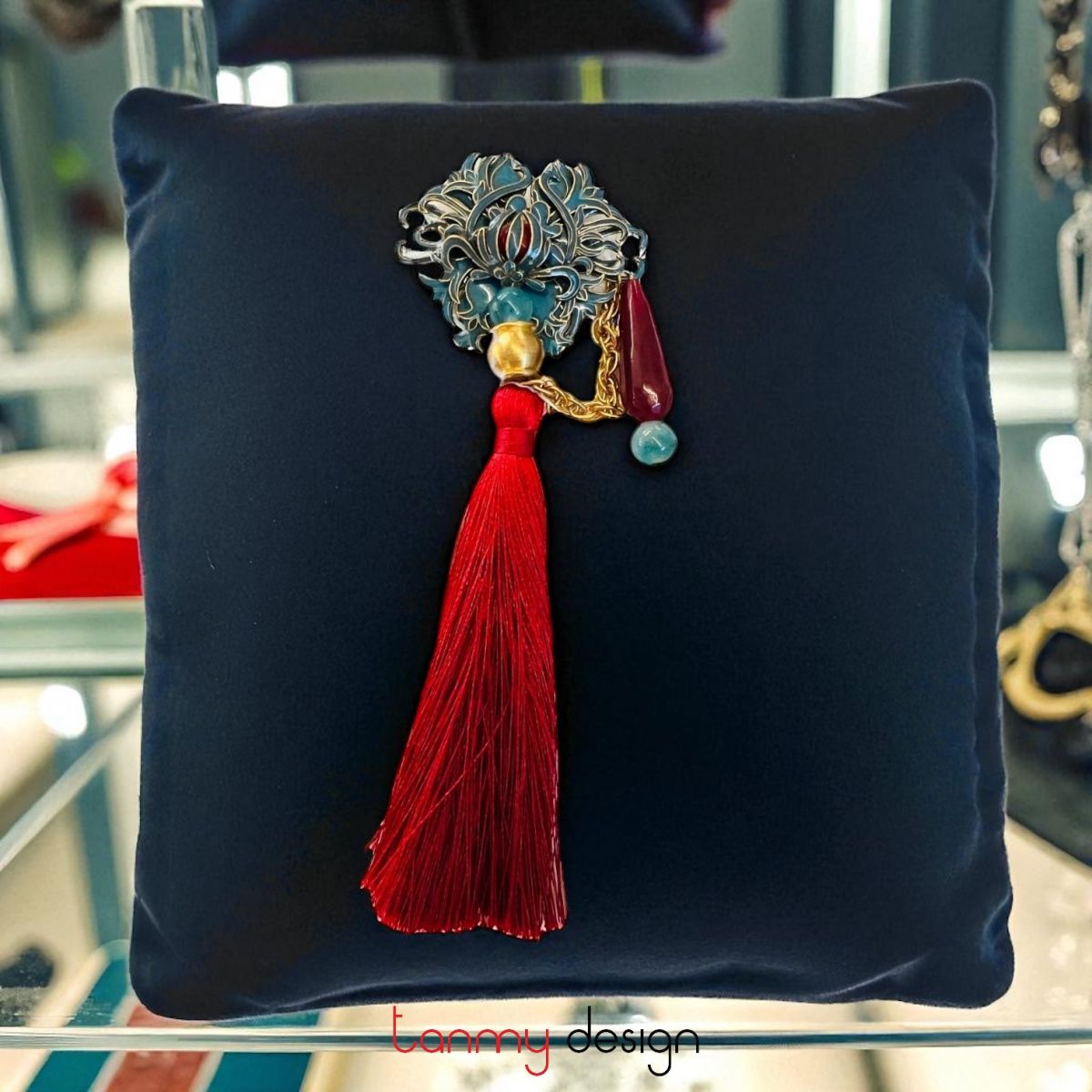 Cài áo kim loại , tua rua đỏ đô, đá mã não đỏ