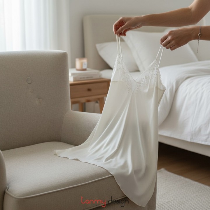 Váy 2 dây satin thêu hoa đào trắng