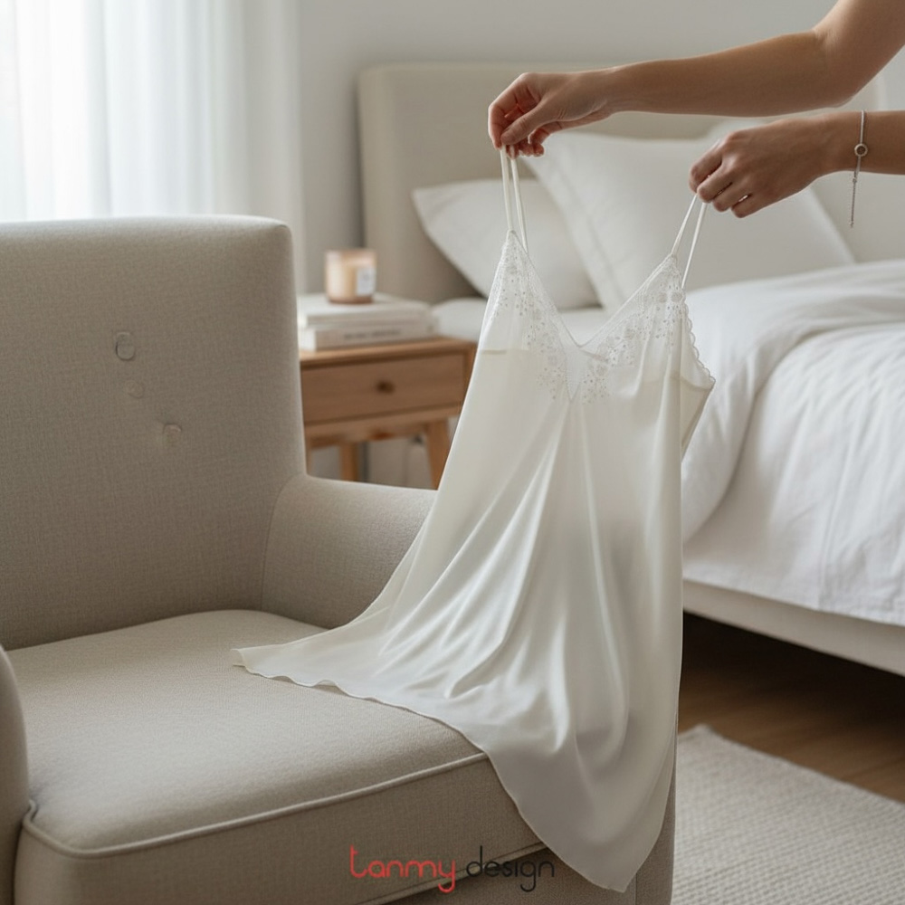 Váy ngủ lụa satin thêu tay Tân Mỹ Design mang lại cảm giác êm ái cho giấc ngủ của bạn mỗi ngày. Tân Mỹ - chính tên thương hiệu của chúng tôi đã nói lên tất cả, "vẻ đẹp mới". Không chỉ mang đến cảm giác cho một sự tươi mới, thời trang Tân Mỹ sẽ giúp bạn tìm thấy được vẻ đẹp bên ngoài và tâm hồn của chính bạn. Hãy dành cho 1/3 cuộc đời - những giấc ngủ êm ái, mềm dịu cùng với váy ngủ lụa thêu tay và áo choàng kimono lụa Hà Đông thêu Tân Mỹ Design mỗi ngày.