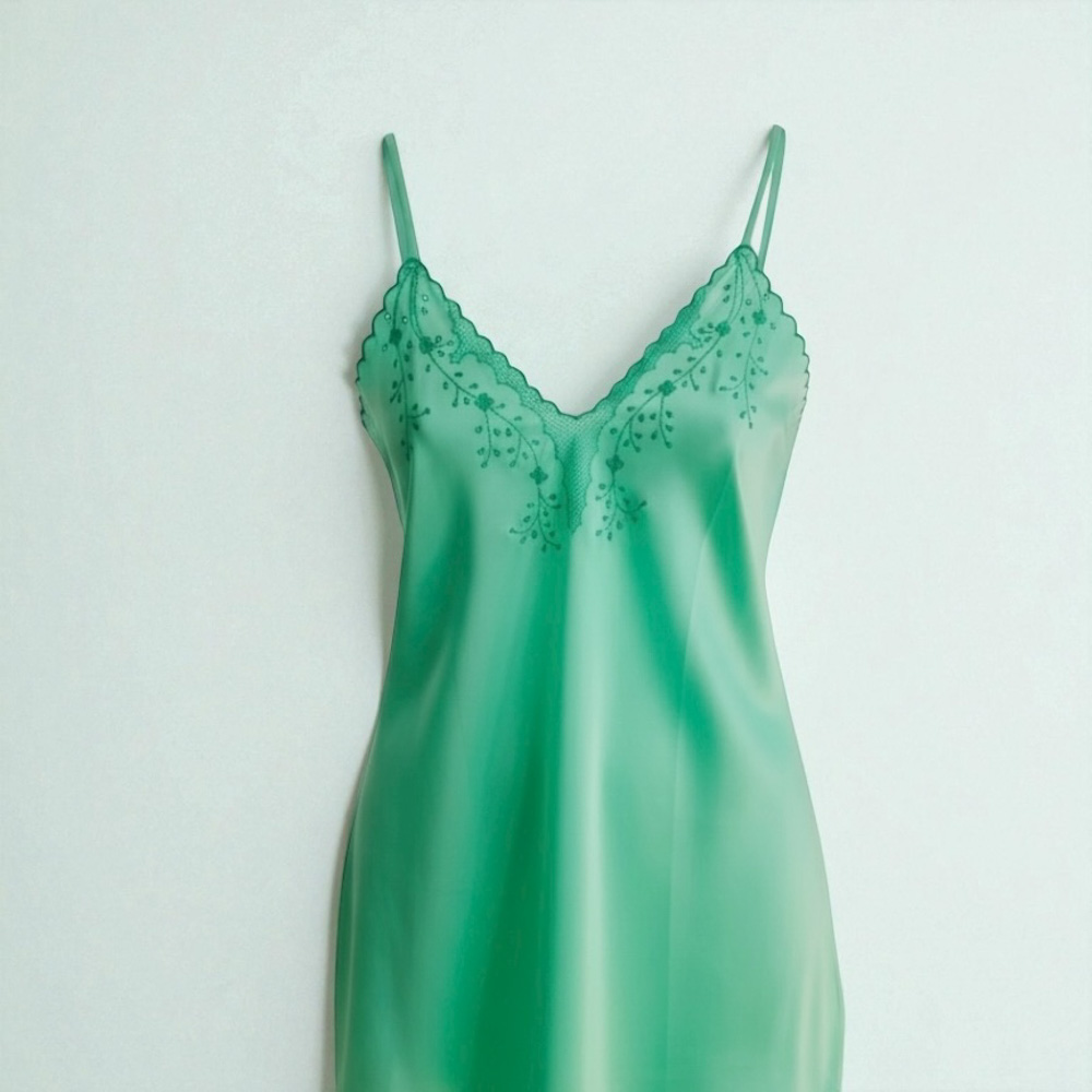 Váy 2 dây satin thêu hoa đào xanh ngọc