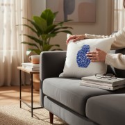 Tựa lưng thêu tay thương hiệu Tân Mỹ trên nền vải linen mang lại cảm giác sang trọng với chất liệu thiên nhiên, không gây kích ứng da.