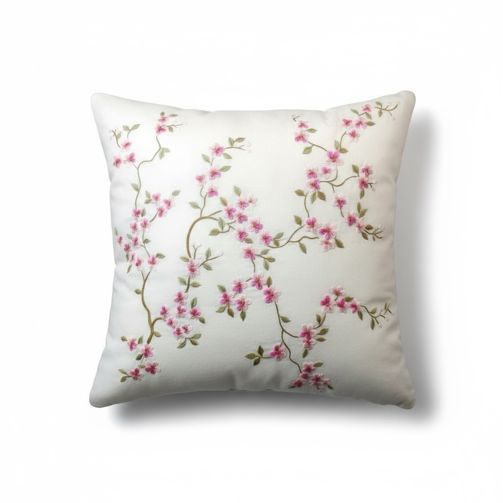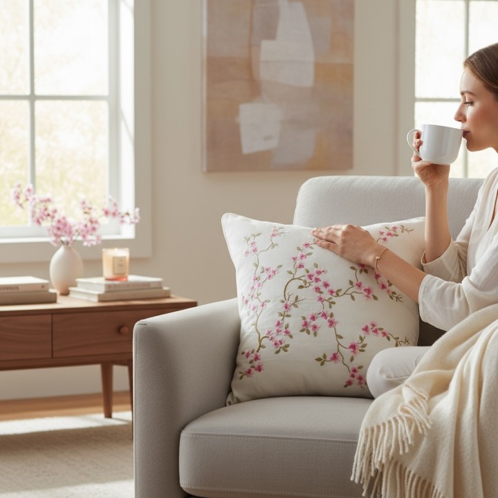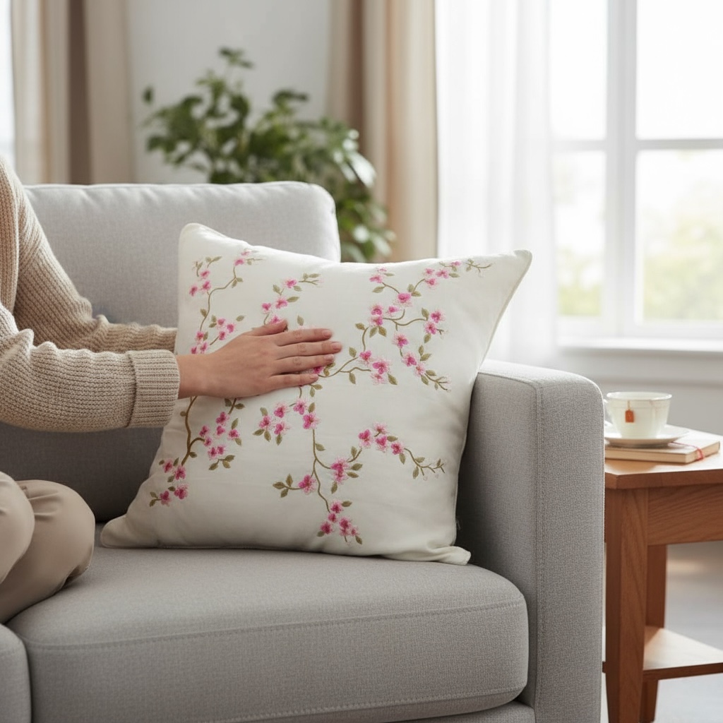 Tựa lưng thêu tay thương hiệu Tân Mỹ trên nền vải linen mang lại cảm giác sang trọng với chất liệu thiên nhiên, không gây kích ứng da.