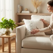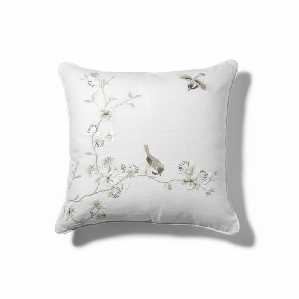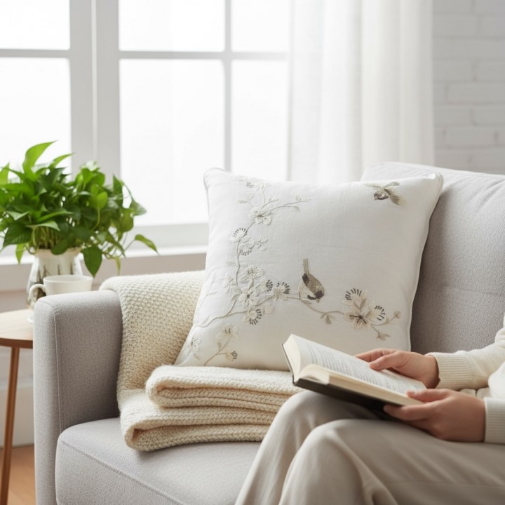 Tựa lưng thêu tay thương hiệu Tân Mỹ trên nền vải linen mang lại cảm giác sang trọng với chất liệu thiên nhiên, không gây kích ứng da.