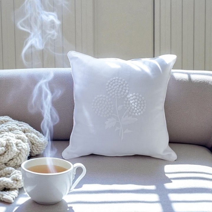 Tựa lưng thêu tay thương hiệu Tân Mỹ trên nền vải linen mang lại cảm giác sang trọng với chất liệu thiên nhiên, không gây kích ứng da.