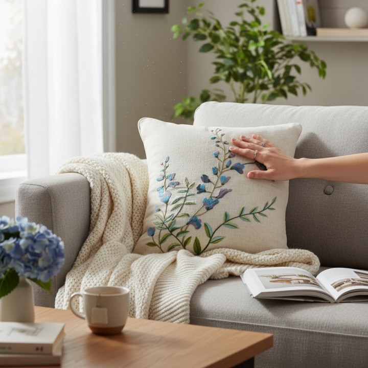 Tựa lưng thêu tay thương hiệu Tân Mỹ trên nền vải linen mang lại cảm giác sang trọng với chất liệu thiên nhiên, không gây kích ứng da.