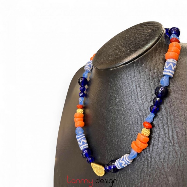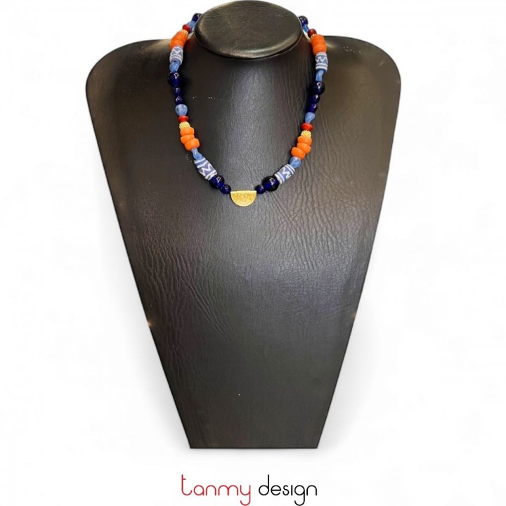 Vòng cổ thiết kế đá Africa xanh, cam, mã não xanh, kim loại mạ vàng