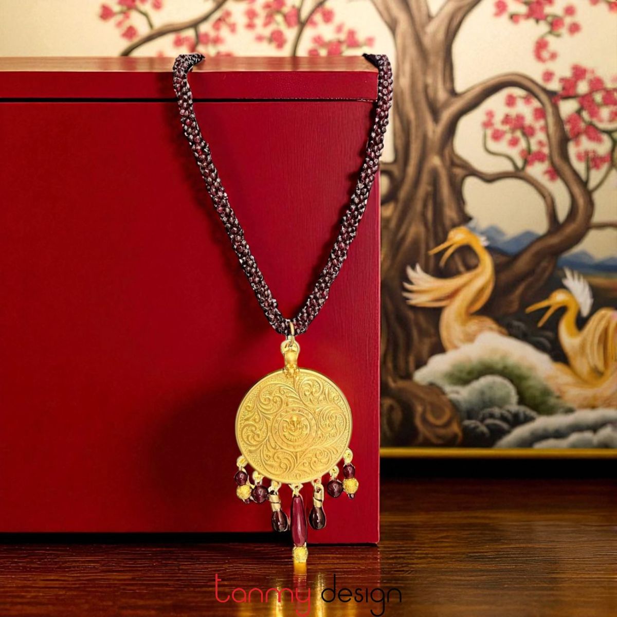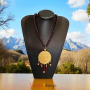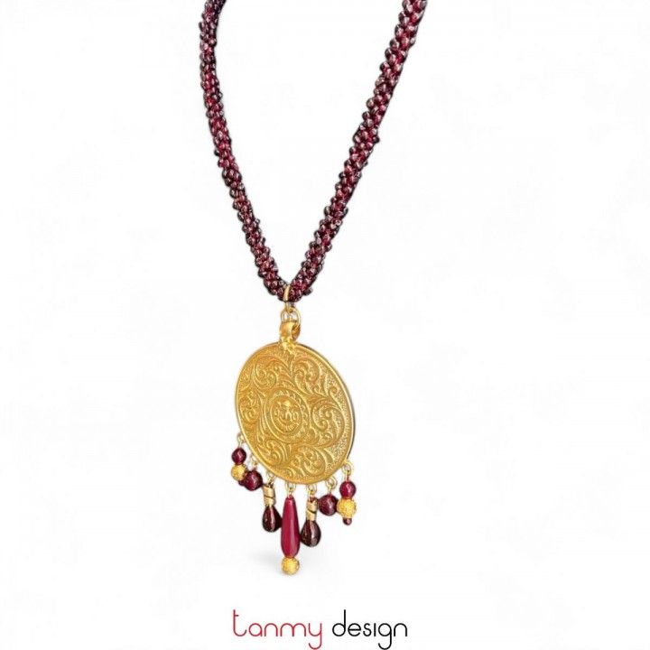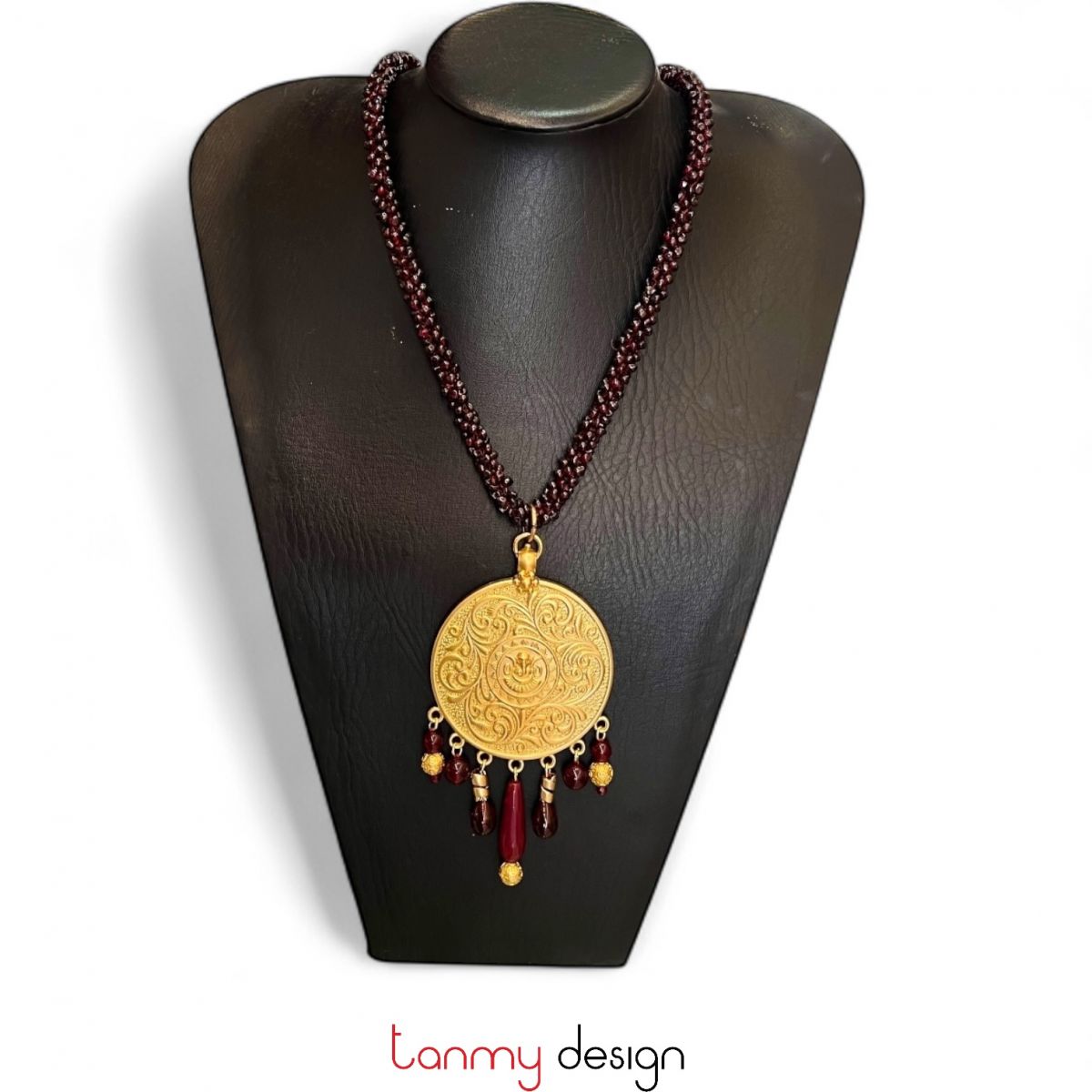 Vòng cổ thiết kế hạt đá hồng ngọc lựu, mặt kim loại vàng tròn, đính hạt thuỷ tinh giọt nước