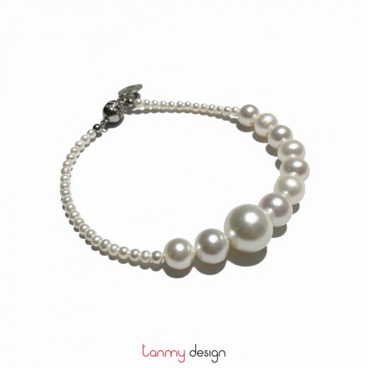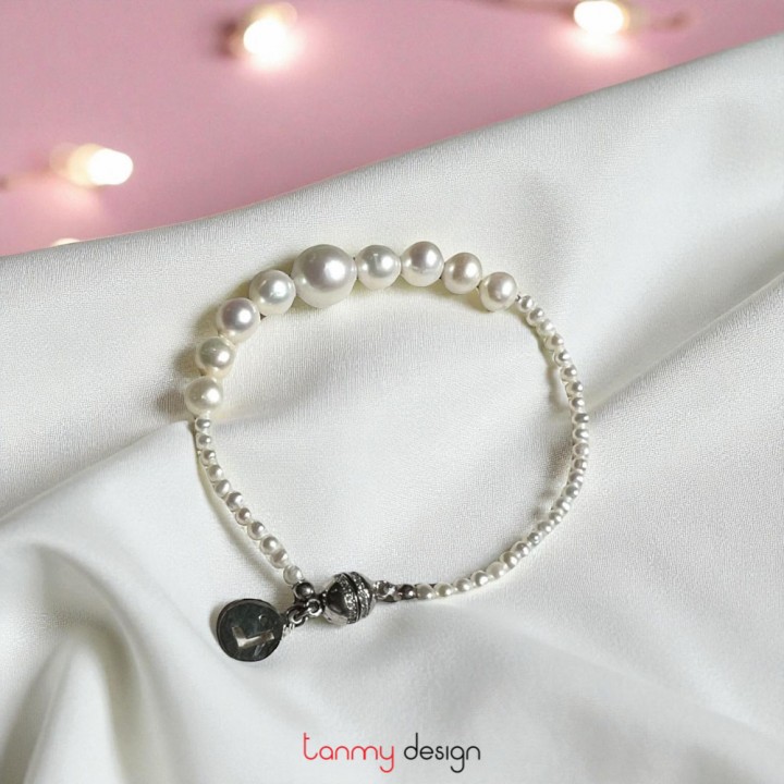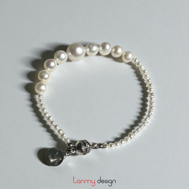 Vòng tay ngọc trai to nhỏ khuy nam châm charm chữ L bạc