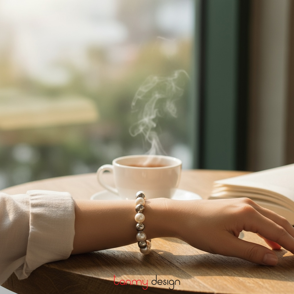 Vòng tay ngọc trai to phối bi bạc to thanh ngang