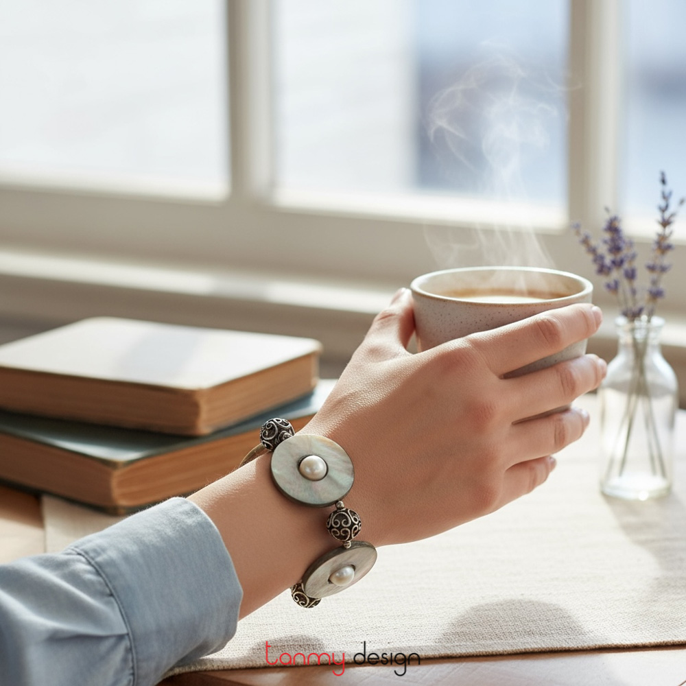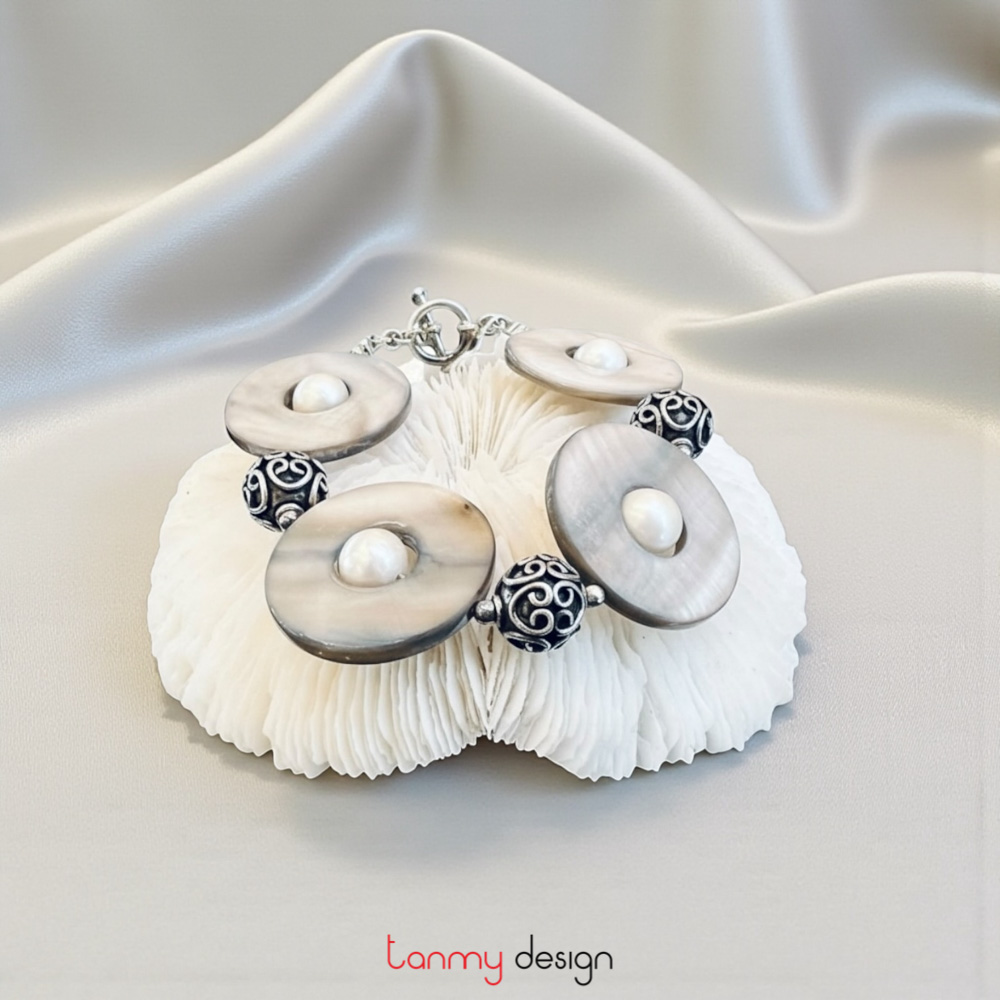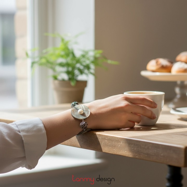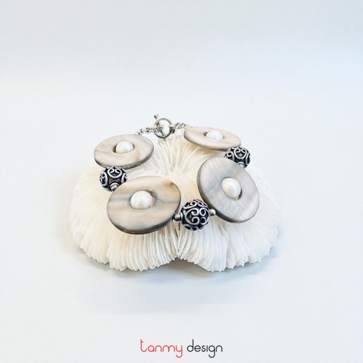 Vòng tay vỏ trai tròn ngọc trai trong viên bạc hoa văn